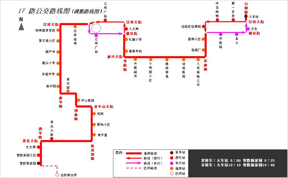 火車站—遼河大街—東新路—新興大街—學府路—遼河大街—市委廣場—遼河大街—新華路—富安園北側(cè)道路—創(chuàng)新路—金牛山大街—體育館路—青花大街—清華路—智勝新家園(終點回返)—清華路—青花大街—體育館路—金牛山大街—創(chuàng)新路—富安園北側(cè)道路—新華路—遼河大街—市委廣場—建設(shè)街—學府路—新興大街—東新路—建設(shè)街—公園路—火車站。